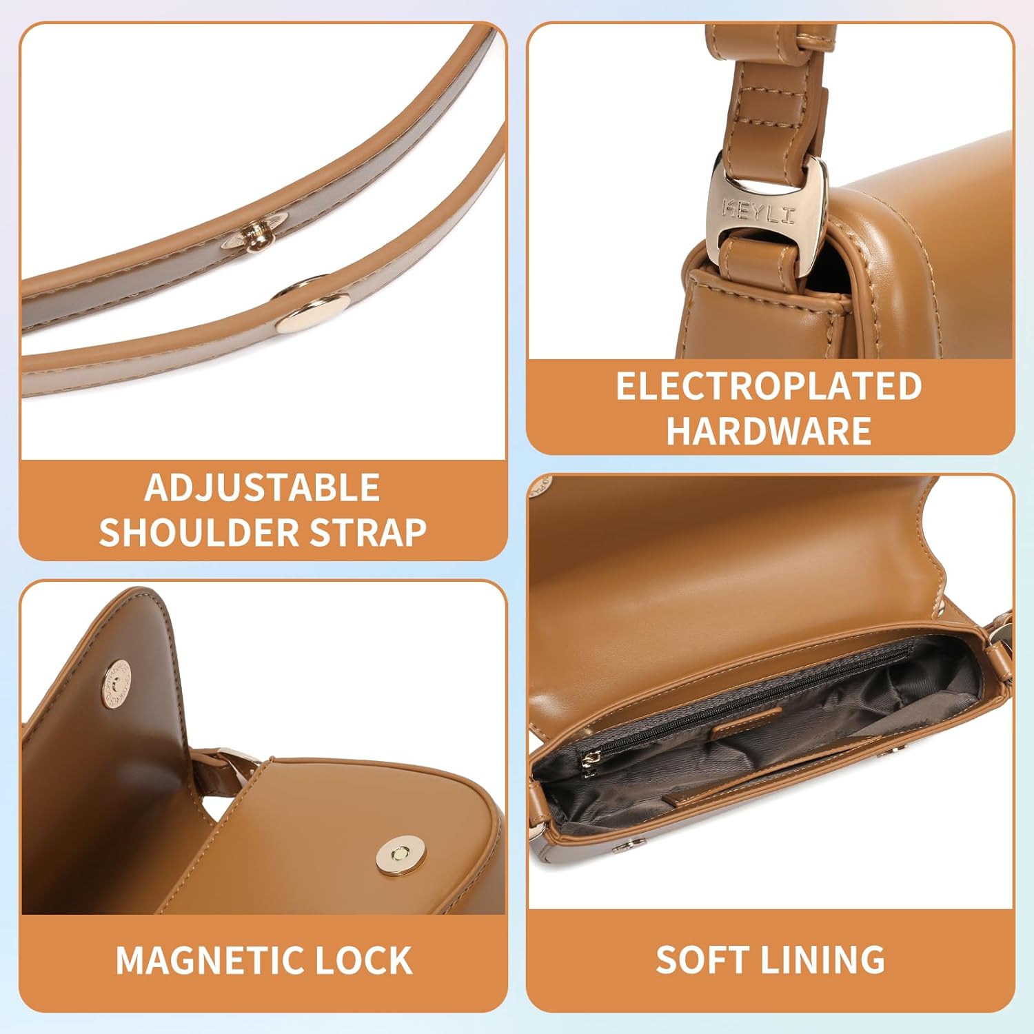 • Design moderno: o design da bolsa de ombro fica mais adorável e lidera a tendência da moda. As bolsas femininas de designer têm fivela magnética para facilitar a abertura e o fechamento, protegendo a segurança do item, pode carregar facilmente sua carteira, celular, chaves e batom. Item pequeno etc.